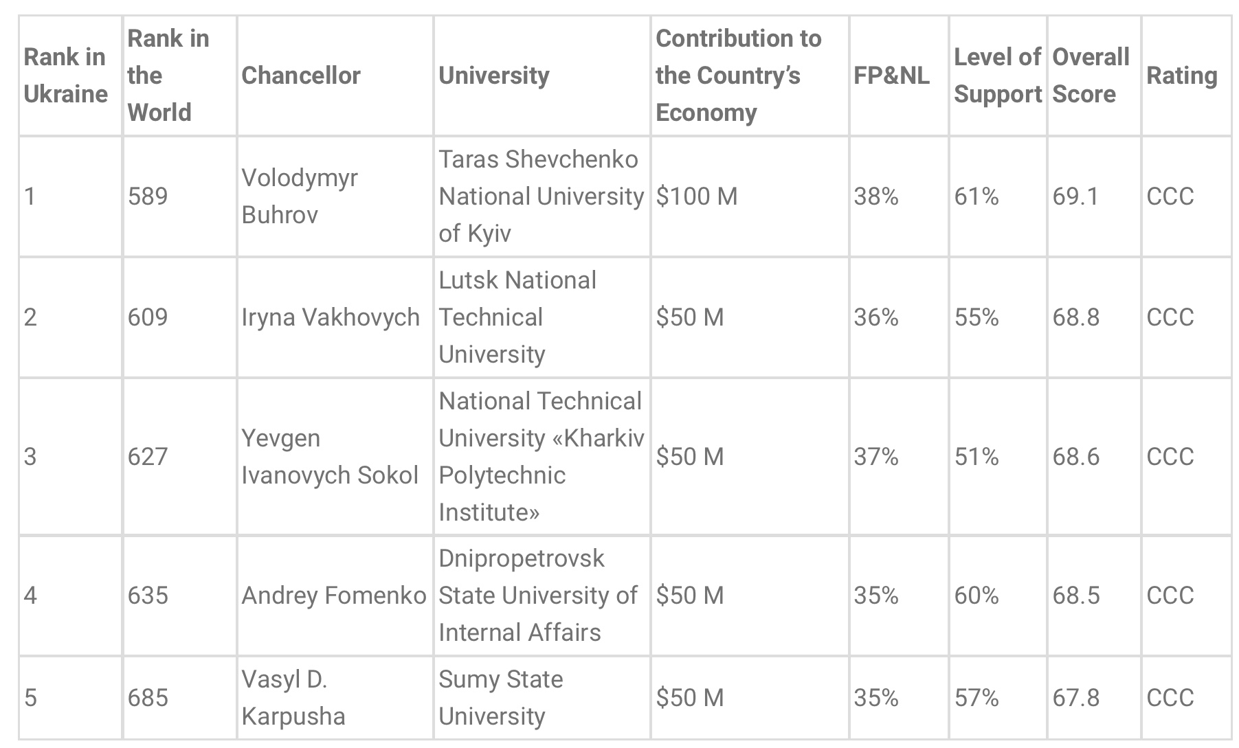П’ятірка кращих ректорів України у рейтинговій таблиці виглядає так: