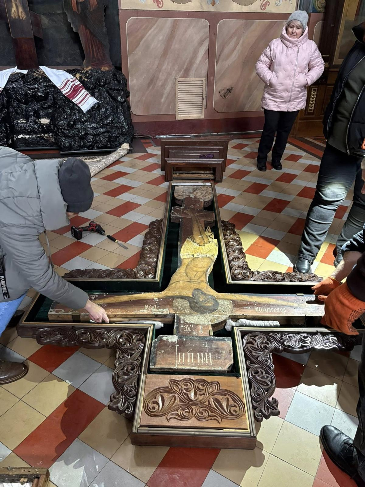 Особливу увагу приділили великоформатній іконі «Розп’яття» XV століття — одній із найцінніших пам’яток українського сакрального мистецтва. Після обстеження та фотофіксації спеціалісти демонтували образ зі стіни й перемістили його до приміщення зі стабільним температурно-вологісним режимом та належною охороною. Реставратори провели дезінфекцію, усунувши ураження пліснявою, а також укріпили левкас і фарбовий шар у місцях пошкоджень.