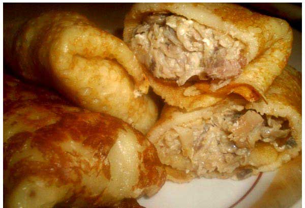 Для тіста ретельно змішати у великій ємності борошно, яйця, сіль і цукор. Сюди потрошки вливаємо молоко кімнатної температури та знову перемішуємо до однорідності. Випікаємо млинці на добре розігрітій сковороді з додаванням олії. Холодну начинку викладаємо на млинець та загортаємо «конвертом».