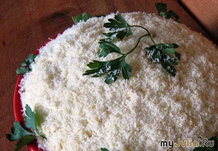 Натерти на крупній тертці картоплю і моркву. На велике плоске блюдо викласти першим шаром картоплю. Сильно не втрамбовувати, але і не залишати шар дуже пухким. Підсолити і залити майонезом. Таким же чином – із морквою. Далі – шар яєць, тертих на крупній тертці (але їх не солити і не покривати майонезом). Бо наступний шар – солона і приправлена курка. Її теж не солити і не змазувати майонезом, а накрити тертою картоплею. Картопляну «шапку» посолити, надати салатові форму торта і щедро обмазати майонезом.  Краї плоскої тарілки прикрасити порізаними печерицями, а зверху притрусити тертим сиром.