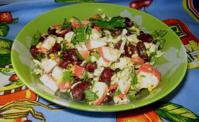 Інгредієнти: квасоля відварна (або консервована) – 150-200 г, крабові палички – 150-200 г, помідори – 2 шт, мариновані огірочки – 2 шт, болгарський перець – 1 шт, зелень кінзи або петрушки, часник – 1-2 зубчики, сік лимона – 1 ст. л., олія, сіль, мелений перець.
