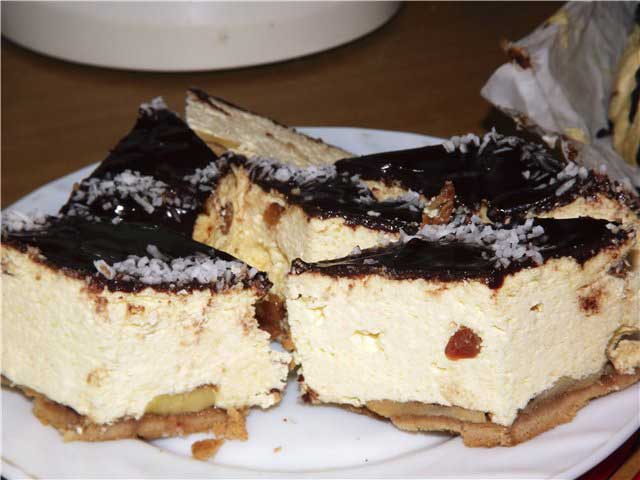 Інгредієнти: 400 г жирного сиру, 200 г вершкового масла, 1 ст. л . желатину, 4 ст. л . цукрової пудри, 2 ч. л. ваніліну, 300 г темного шоколаду, 100 г вівсяного печива, 100 г густого ягідного джему.