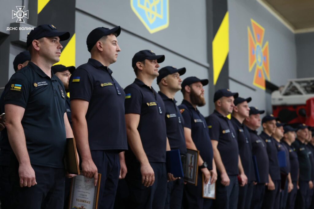 Співробітники служби порятунку Волині, які проявили особливу мужність, рішучість і професіоналізм в умовах воєнного стану, а також за високопрофесійне виконання службових обов’язків під час ліквідації наслідків ворожого обстрілу в Луцьку 6 червня, відзначені нагородами.