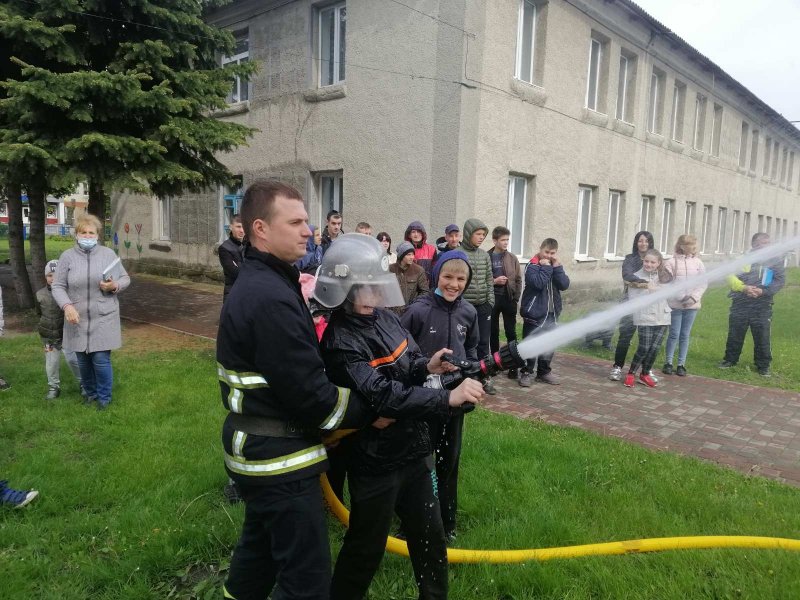 Після проведення практичних дій співробітники ДСНС продемонстрували дітям пожежно-рятувальне обладнання, що є на озброєнні пожежної частини, розповіли принцип його застосування. Кожен зміг відчути себе у ролі рятувальників, примірявши захисні костюми, бойовий одяг та подати воду з пожежного автомобіля.