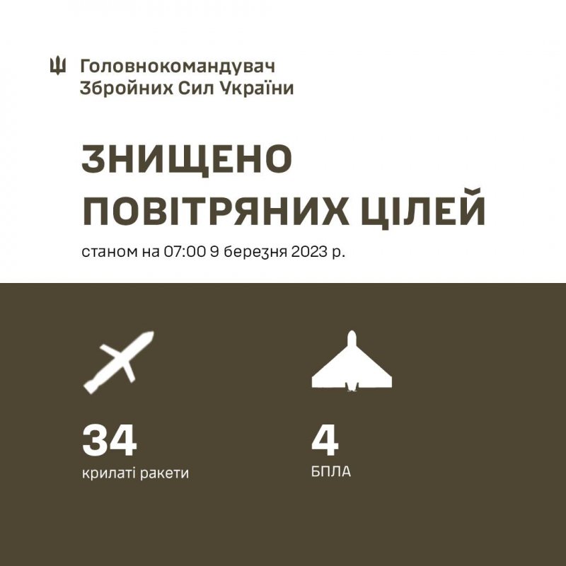 Силами та засобами Повітряних Сил СЗУ у взаємодії з підрозділами інших складових Сил оборони України із 48 крилатих ракет Х-101/Х-555, «Калібр» знищено 34 крилаті ракети, а також 4 БпЛА «Shahed-136/131».
