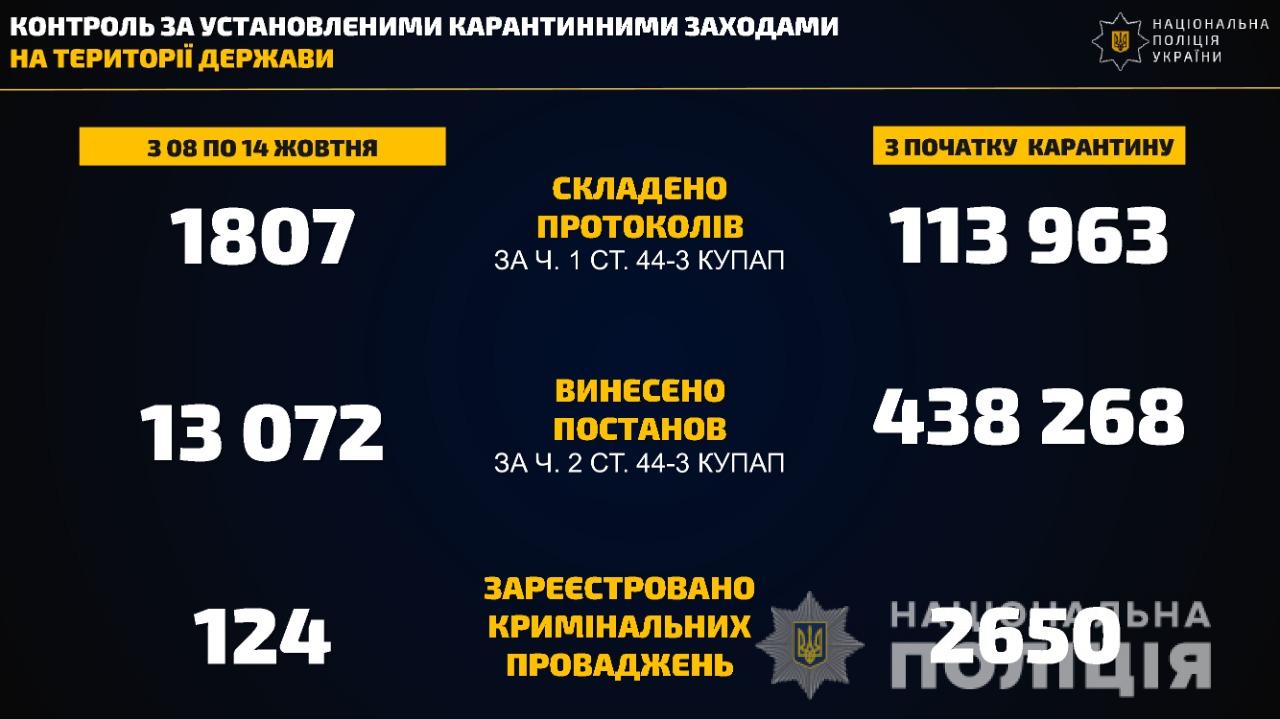 Водночас з початку карантину складено  113 963 адміністративні протоколи  за ч.1 ст. 44-3 (Порушення правил щодо карантину людей ) КУпАП, винесено постанов за ч.2 ст. 44-3  КУпАП – 438 268.