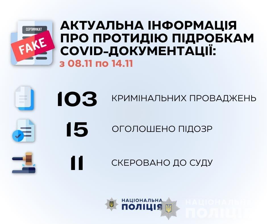Упродовж минулого тижня поліцейські розпочали 103 кримінальні провадження за підробку та використання COVID- тестів та довідок про вакцинацію.