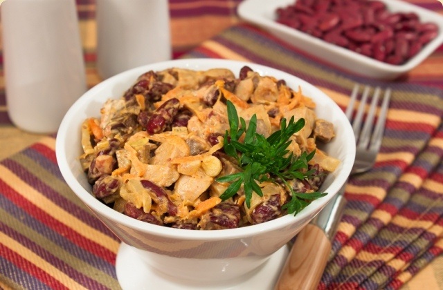 змішуємо варену квасолю, печінку, гриби, засмажку з цибулі та моркви. Все це