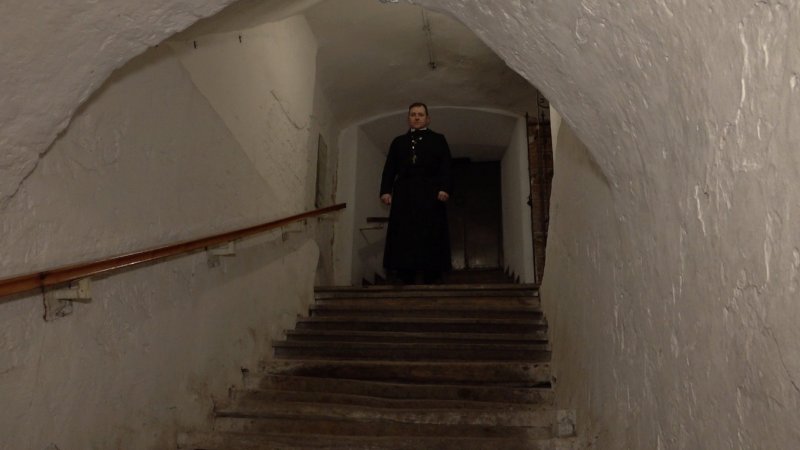 серед експонатів – труни, на вході – монах, а щоб зайти до підземелля, слід