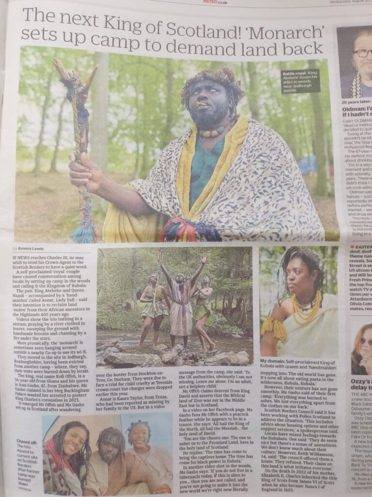 36-річний ганець Кофі Оффех та 43-річна Жан Гашо, родом із Зімбабве, вперше прибули до цього району навесні. Назвавшись королем Атехехе та королевою Нанді, вони створили табір на схилі пагорба над шотландським містом. Це чоловік і дружина, які живуть у законному шлюбі.