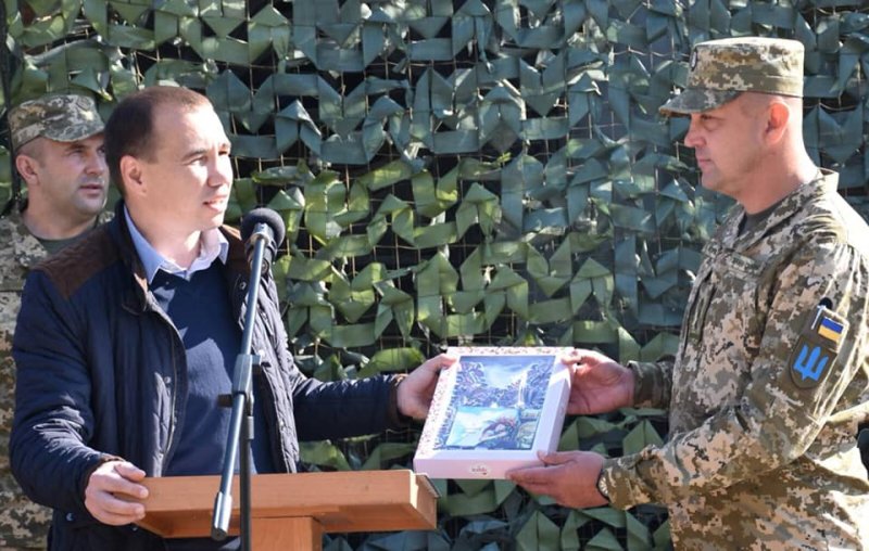 джерел: Ярослав Матвійчук вручає вишиті обереги комбригові, полковнику Сергію Войченку.