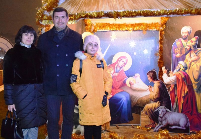 сфотографувалися біля різдвяної композиції.