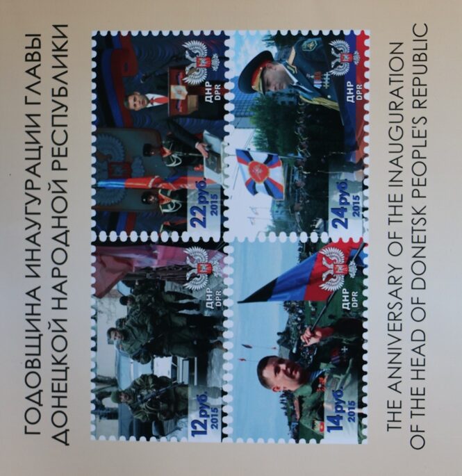 поштові ювілейні марки банд формування ОРДЛО на честь першої річниці «коронування»
