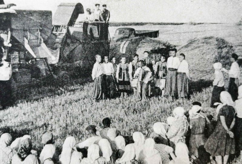 На фото з архіву: агіткультбригада в с. Тростянець розповідає колгоспникам про героїчну боротьбу членів КПЗУ проти «панської шляхти».