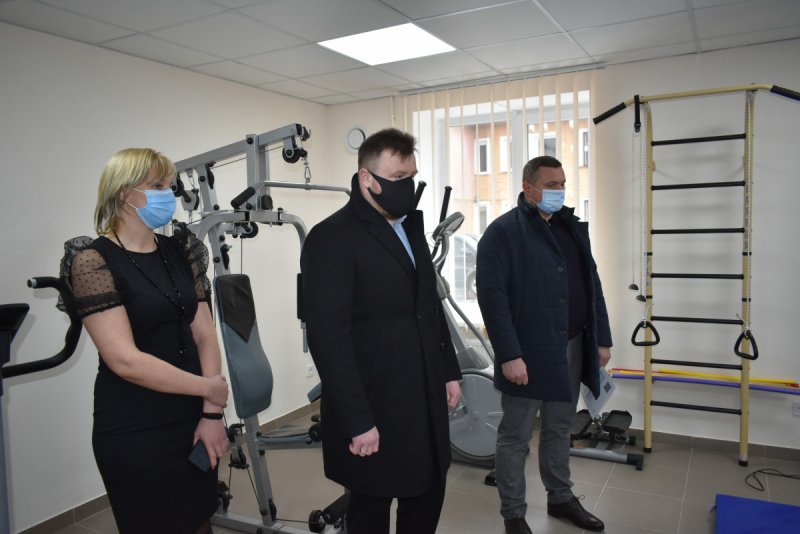На фото управління інформаційної політики та цифрової трансформації облдержадміністрації: Юрій Погуляйко (крайній справа) знайомиться з умовами роботи в реконструйованій амбулаторії; працівники медзакладу; інклюзивні можливості амбулаторії.