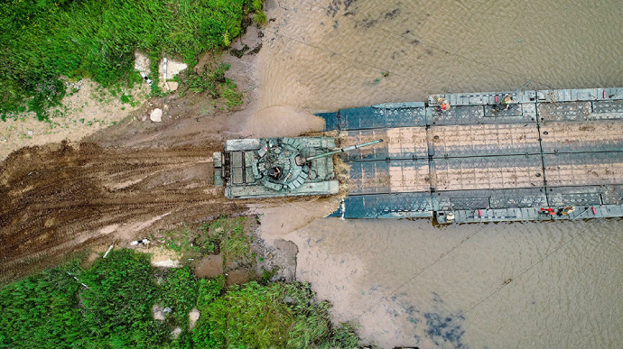 фото «Української правди»: російський танк просувається на понтонний міст.