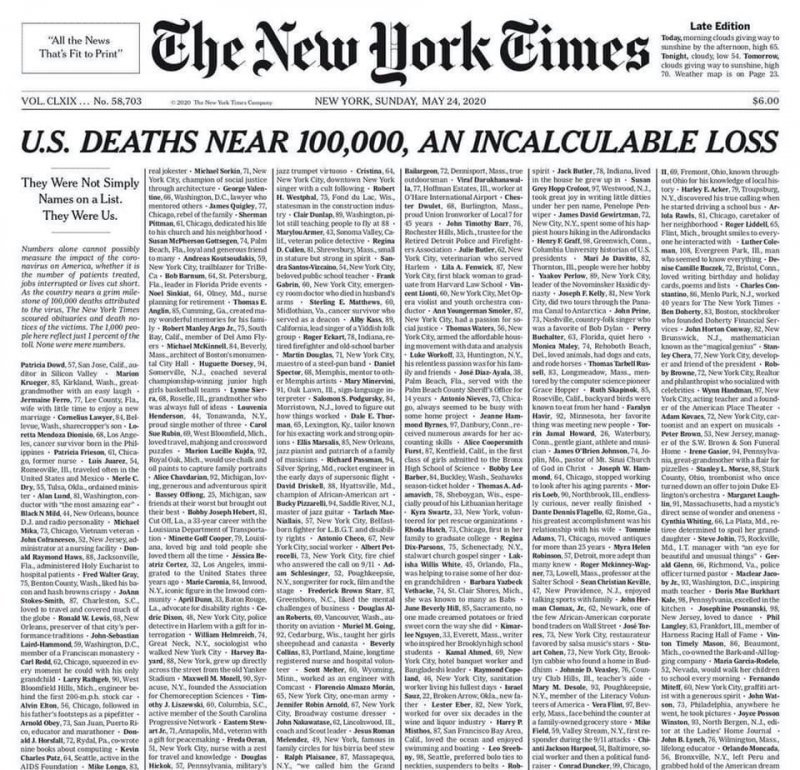 Американська газета The New York Times помістила на першій шпальті газети за 24 травня список імен людей, які померли в США від коронавірусу.