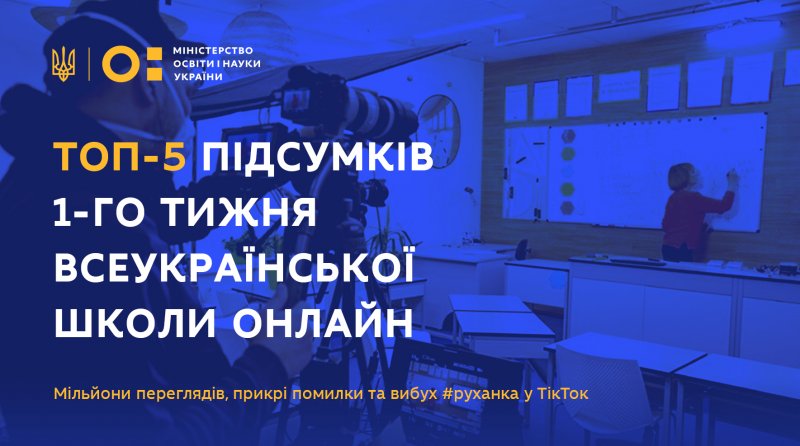 Міністерство освіти і науки зібрало короткі підсумки першого тижня роботи проєкту – тут і про прикрі помилки, і про вибух інтересу в ТikTok, і цікава статистика про те, хто та які саме уроки найбільше дивились на медіаресурсах МОН.