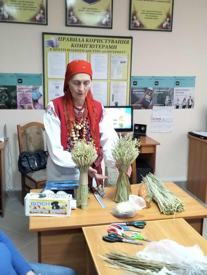 У вступному слові пані Валентина розповіла про себе, що володіє елементом нематеріальної культурної спадщини «Соломоплетіння і народна фольклористика Турійщини». Працювати з соломою майстриня почала, коли вчителювала у школі. Солому для виробів вона вирощує і заготовляє самостійно: у червні зрізає зелене озиме жито і висушує стебла.