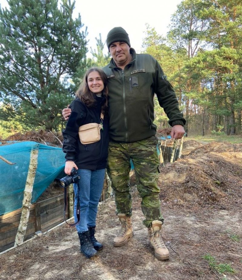 Журналістка медіа «Ґрунт» Надія Суха з уже легендарним бійцем-богатирем 100 Волинської Обр ТрО