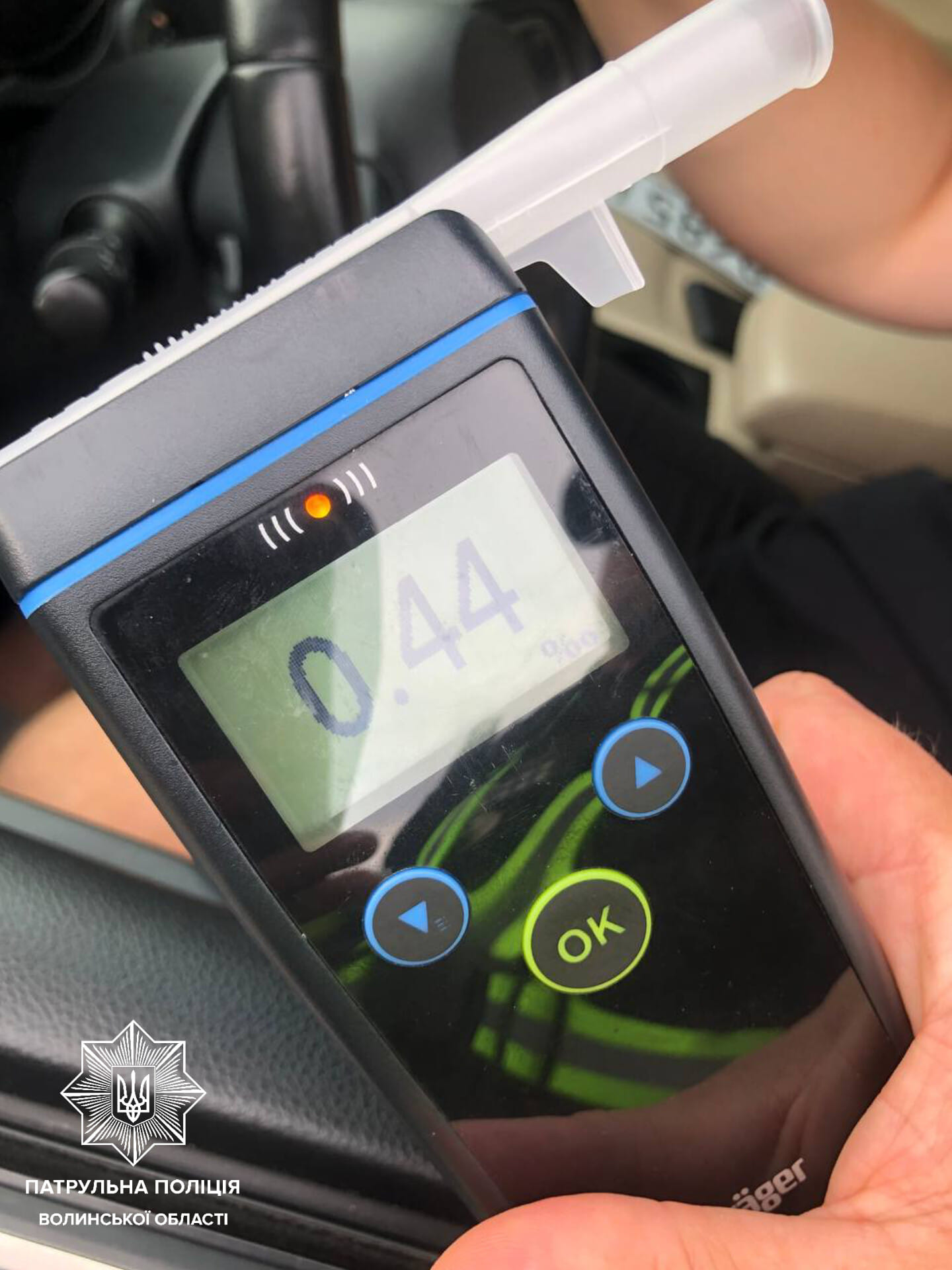 Громадянин не мав посвідчення водія. Крім того, під час спілкування патрульні помітили у нього ознаки алкогольного сп’яніння. Чоловік погодився пройти освідування на місці події, й здогадки поліцейських підтвердилися. Прилад Drager показав результат у 0,44 проміле.