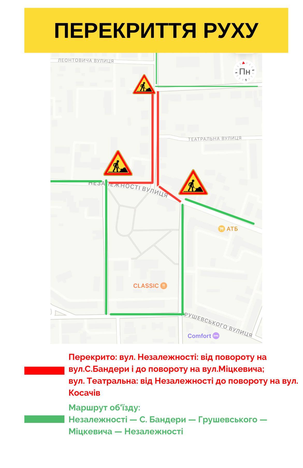 Маршрут об‘їзду: вул. Незалежності — вул. С. Бандери — вул. Грушевського— вул. Міцкевича —вул. Незалежності.