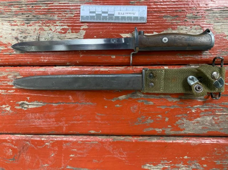 Під час поверхневої перевірки у нього виявили предмет ззовні схожий на штик-ніж. На місце події викликано слідчо-оперативну групу, приїхавши за адресою правоохоронці  відібрали у 44-х річного  правопорушника пояснення та вилучила небезпечний  предмет для проведення експертизи.
