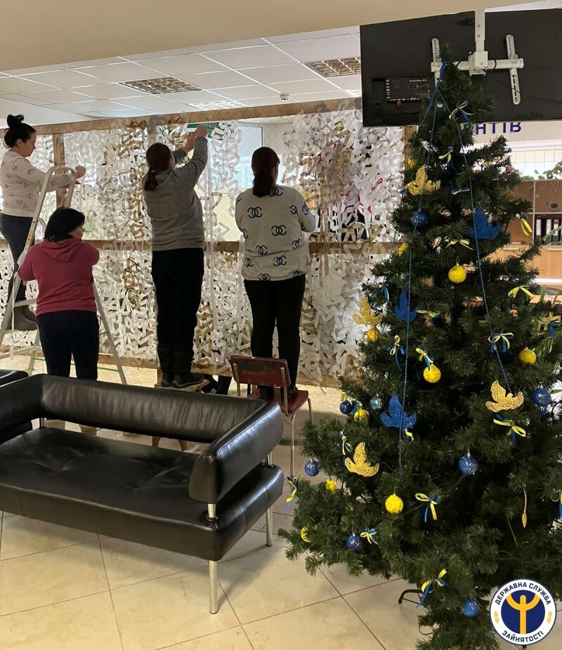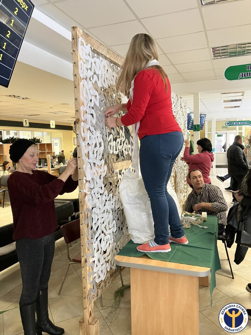 У грудні цього року 15 громадян, які перебувають на обліку як безробітні в Луцькій філії Волинського ОЦЗ залучили до суспільно корисних робіт з плетіння сіток та «кікімор» для захисту наших військових. У приміщенні Центру надання адміністративних послуг, що у Луцьку, за підтримки волонтерки Олени Мисковець, члени Армії відновлення щоденно займаються виготовленням сіток для фронту.