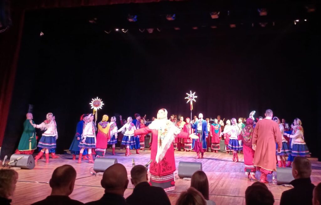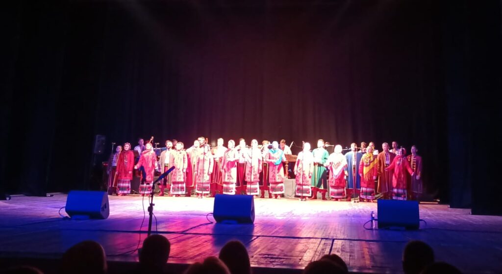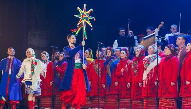 На фото Агенції Укрінформ та автора: Національний заслужений академічний народний хор України імені Григорія Верьовки на сцені облмуздрамтеатру.