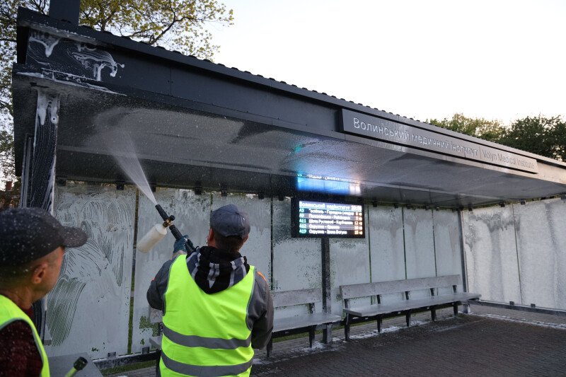Миття зупинок — справа не нова. Оновлюють їх здебільшого після зими. Спочатку приділяють увагу “розумним”, а потім тим, які не обладнані електронними засобами. Однак, прибирання там не менш ретельне. У Луцьку миються навіть сміттєві урни.