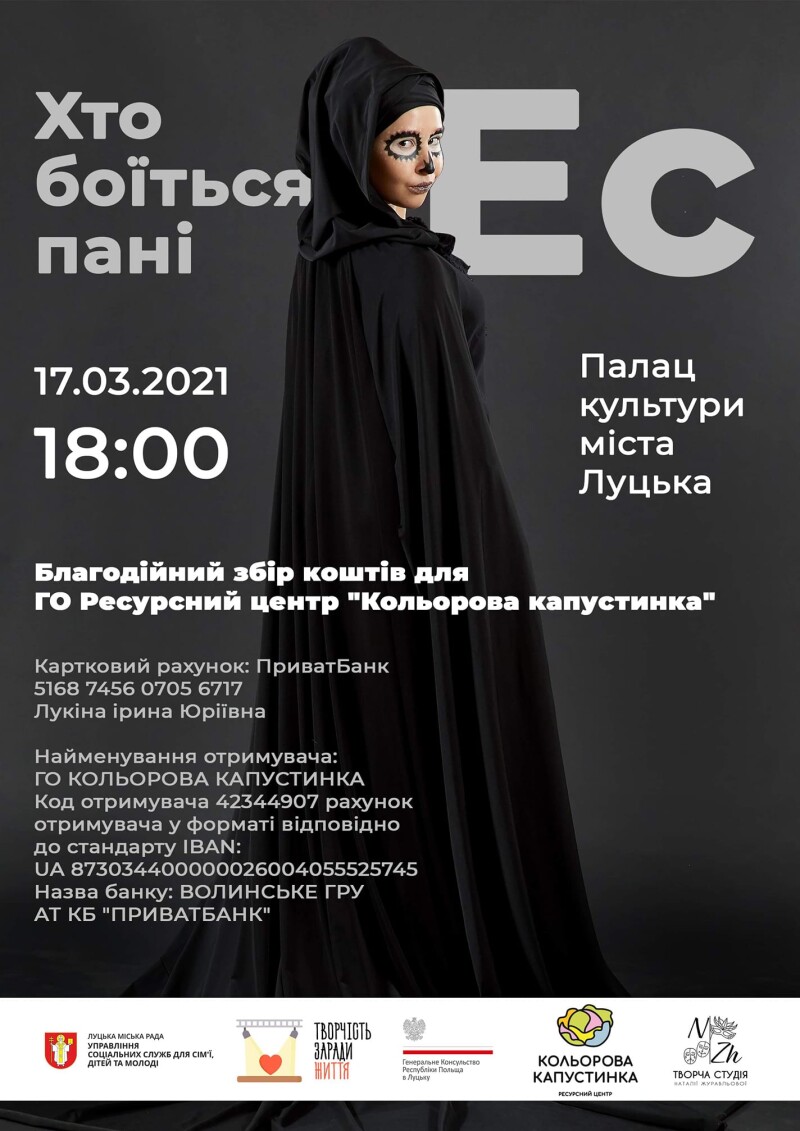 Завтра, 17 березня, відбудеться прем’єра вистави «Хто боїться пані Ес» драматургині Марти Ґусьновської. Захід відбуватиметься в рамках благодійної програми #Творчість заради життя. Виставу підготували учасники творчої студії Наталії Журавльової.