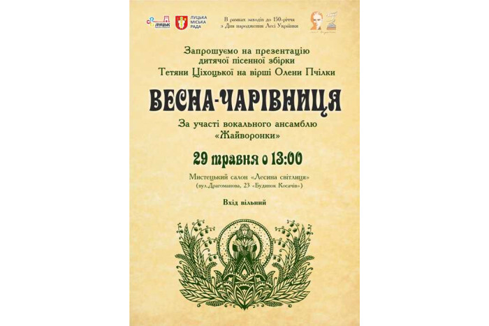 29 травня 2021 року в межах проєкту «Мистецький салон «Лесина світлиця», що приурочений 150-річчю від дня народження Лесі Українки, відбудеться презентація пісенної збірки Тетяни Ціхоцької на вірші Олени Пчілки «Весна-чарівниця» .