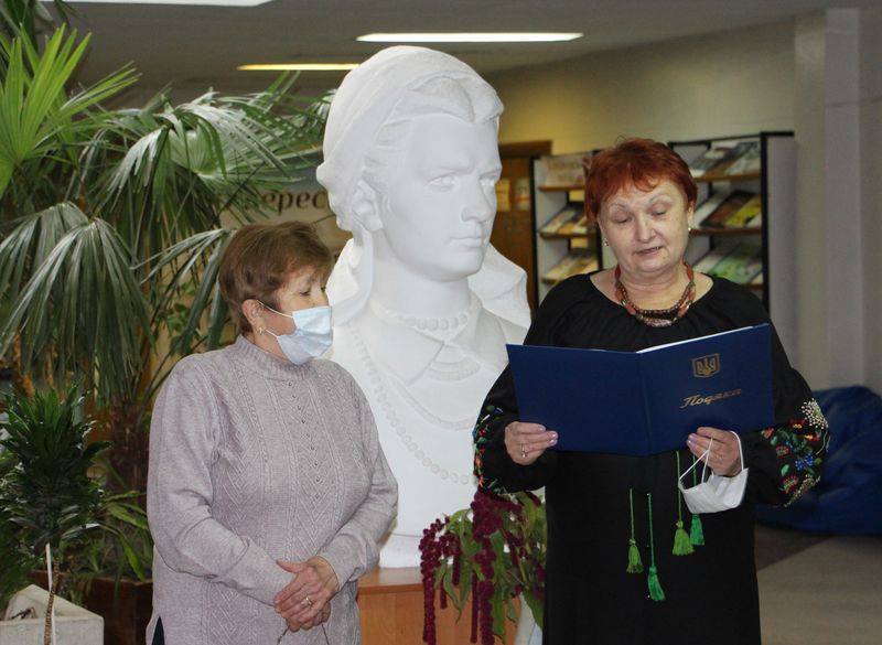 Із сторінками історії спорудження пам’ятника Олені Пчілки та роботою колективу над увічненням пам’яті, напередодні 150-річчя від дня народження Лесі Українки розповіла директорка бібліотеки Людмила Стасюк. За дорученням управління культури, з питань релігій та національностей облдержадміністрації вона вручила Клавдії Степанівні Блащук Подяку обласної ради за багаторічну сумлінну працю та в зв’язку з 80-річчям бібліотеки.