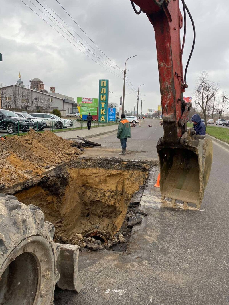 Роботи триватимуть до повного відновлення мережі. Аварійники замінять частину колекторної труби на нову. Забезпечується повний відвід стоків відкритим способом.