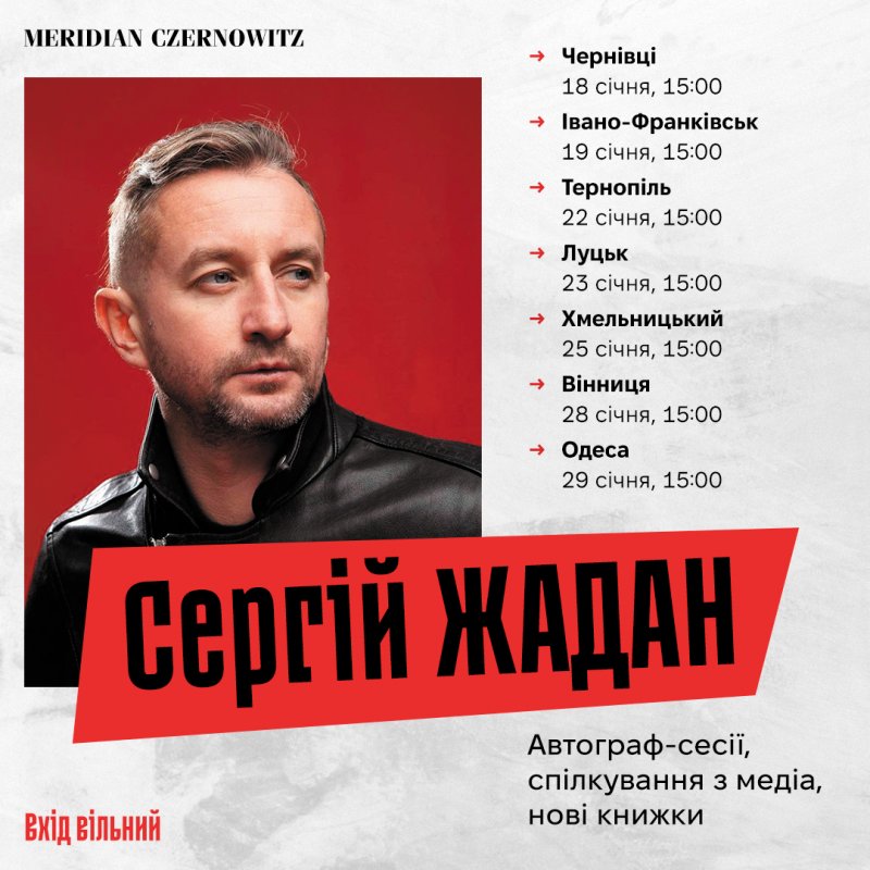 Сергій Жадан – автор зокрема поетичних збірок «Життя Марії», «Тамплієри», «Антена», «Список кораблів», «Псалом авіації», п’єси «Хлібне перемир’я», роману «Інтернат», а також романів «Ворошиловград» і «Месопотамія», які зовсім нещодавно були перевидані в оновленому оформленні видавництвом MeridianCzernowitz.
