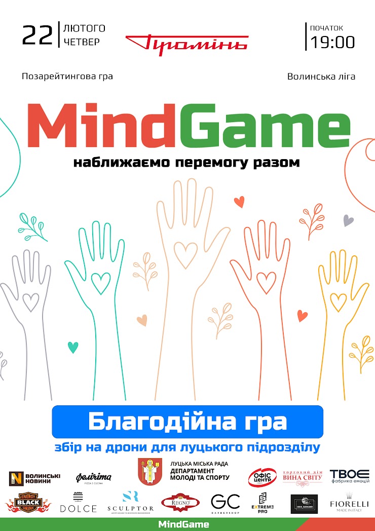 22 лютого о 19:00 в РЦ «Промінь» пройде благодійна гра «MindGame», за кошти з якої придбають дрон FPV для одного з луцьких підрозділів.