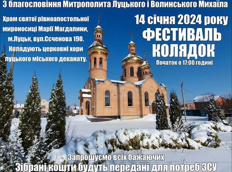 14 січня, в неділю, о 17 год, у храмі Рівноапостольної Марії Магдалини (вул. Сєченова, 19-Б) відбудеться фестиваль колядок парафіяльних хорів міського благочиння.