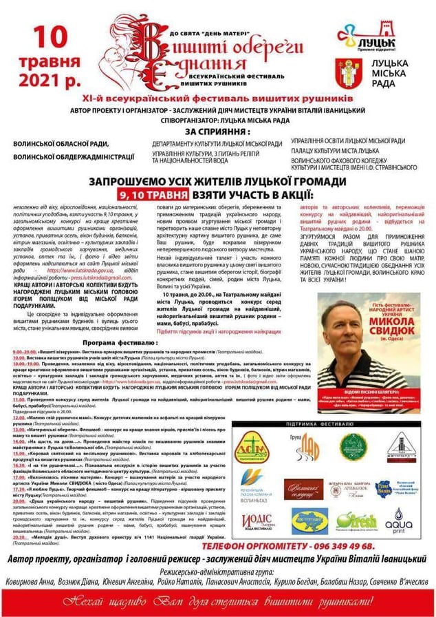ХІ-й всеукраїнський фестиваль вишитих рушників «Вишиті обереги єднання» відбудеться у Луцьку 10 травня 2021 року.