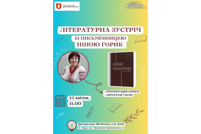 22 квітня у центральній бібліотеці для дітей відбудеться літературна зустріч із волинською письменницею, членом Національної спілки письменників України Ніною Петрівною Горик та презентація її поетичної збірки «Лінії оборони».