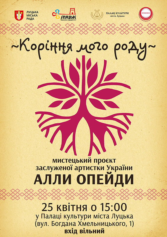 У неділю, 25 квітня, о 15:00 у Палаці культури міста Луцька відбудеться мистецький проєкт заслуженої артистки України Алли Опейди “Коріння мого роду”.