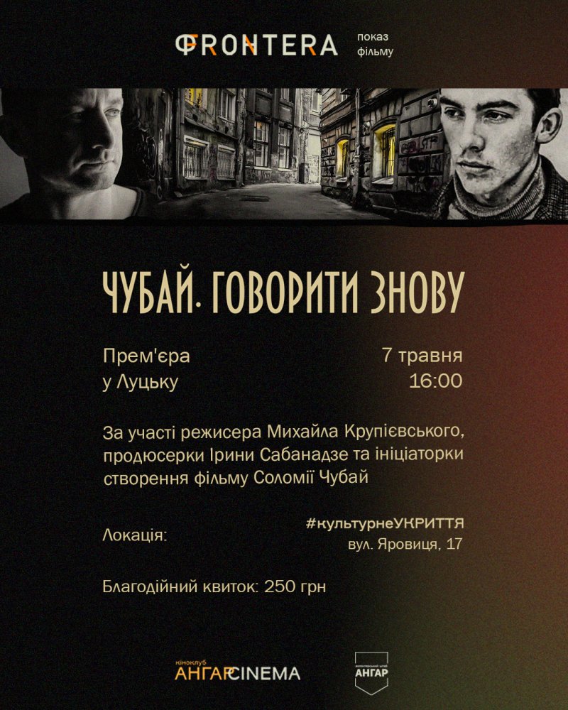 У неділю, 7 травня у лучан буде унікальна нагода подивитися фільм «Чубай. Говорити знову» разом із його творцями. Організатори заходу: команда Міжнародного літературного фестивалю «Фронтера» та кіноклуб легального авторського кіно в Луцьку «Ангар Cinema».