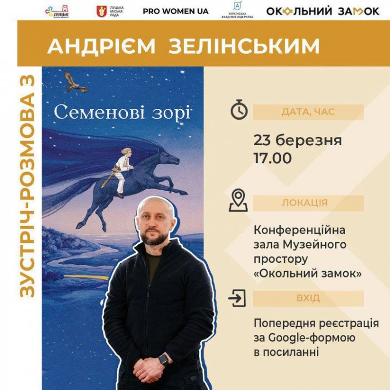 Лучан та гостей міста запрошують на презентацію книги Андрія Зелінського «Семенові зорі». Захід відбудеться 23 березня о 17:00 в музейному просторі «Окольний замок» (м. Луцьк, вул. Кафедральна, 6).
