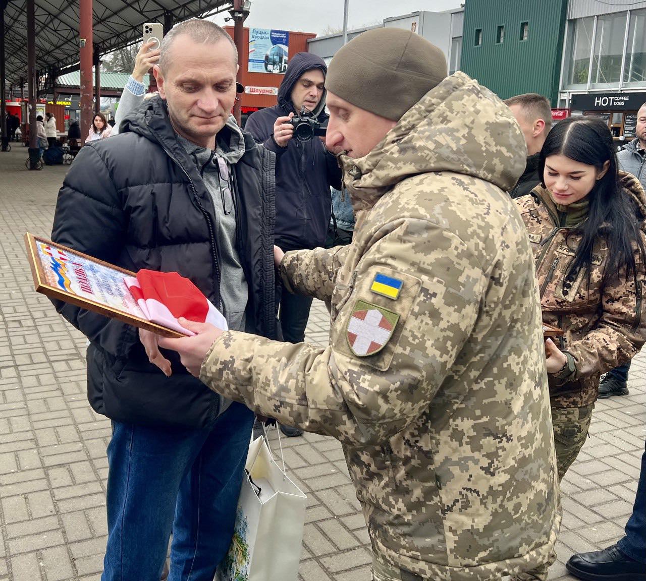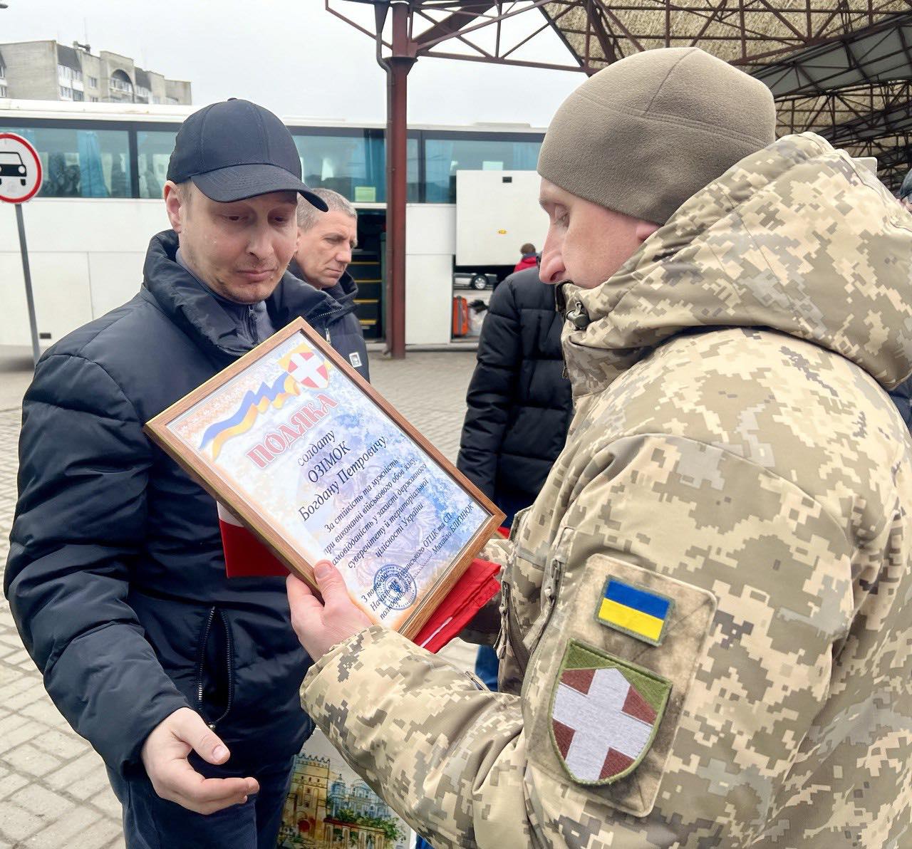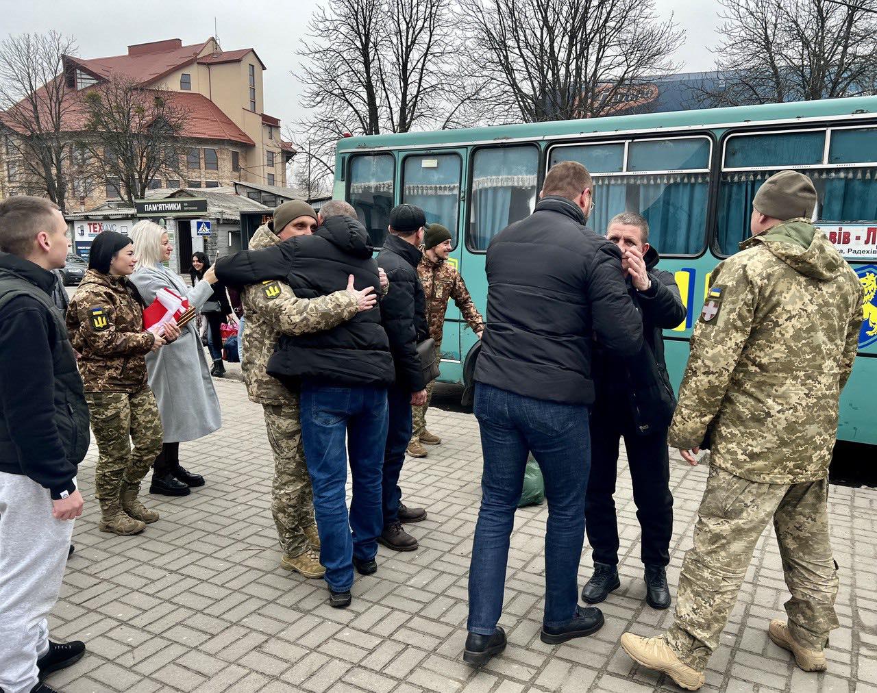 Начальник Луцького гарнізону полковник Михайло Близнюк, Луцький міський голова Ігор Поліщук та військовослужбовці Волинського ОТЦК та СП, рідні люди військових, побратими, друзі та мешканці Луцька тепло й щиро зустріли наших Героїв після півторарічного полону та подарували їм подарунки, подяки від Волинського ОТЦК та СП та прапори рідної Землі-Волині.