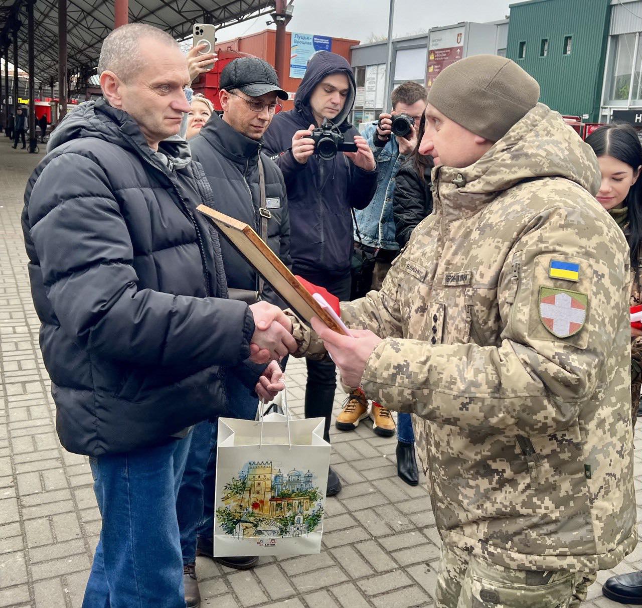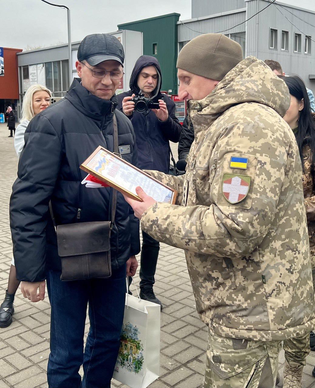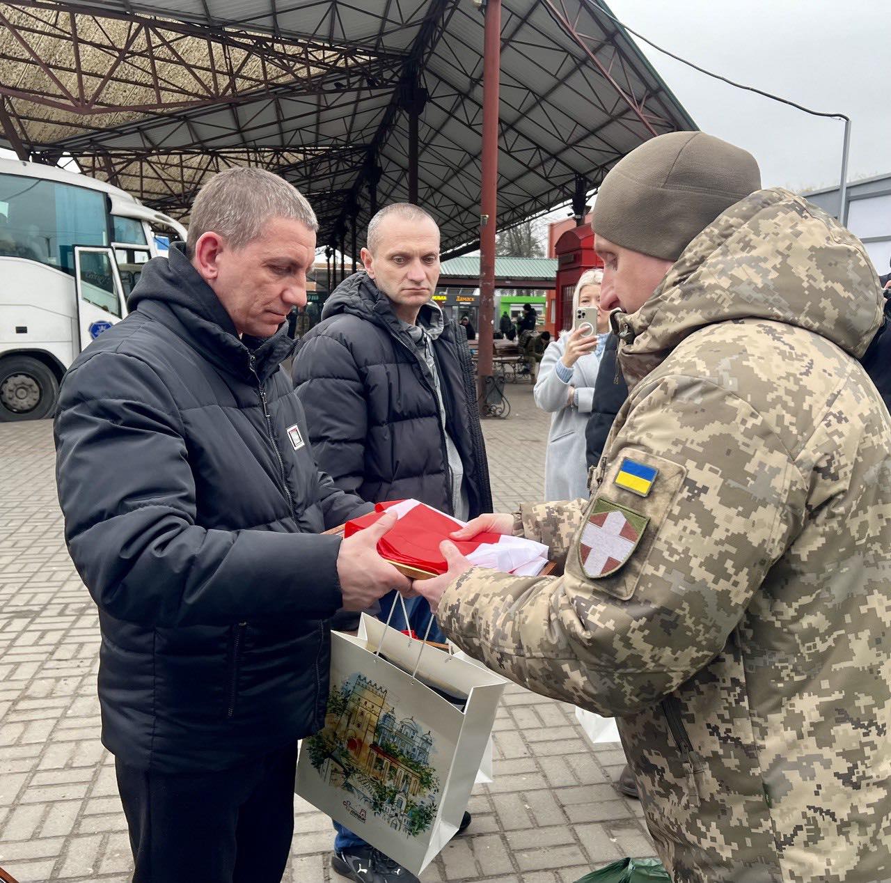 Начальник Луцького гарнізону полковник Михайло Близнюк, Луцький міський голова Ігор Поліщук та військовослужбовці Волинського ОТЦК та СП, рідні люди військових, побратими, друзі та мешканці Луцька тепло й щиро зустріли наших Героїв після півторарічного полону та подарували їм подарунки, подяки від Волинського ОТЦК та СП та прапори рідної Землі-Волині.