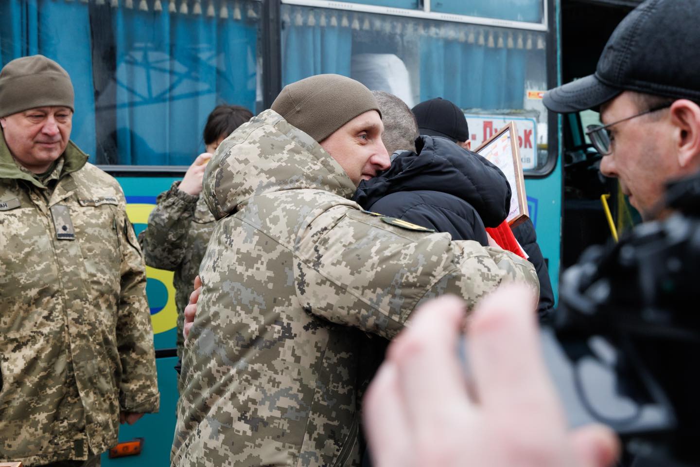 “Дякую за захист рідної землі, мужність та витримку. Бажаю вам та вашим рідним здоров’я та довгої щасливої долі. Ці обійми – це найменше, чим ми можемо віддячити Вам, наші Герої, які побували у пеклі”, – говорить полковник Михайло Близнюк.