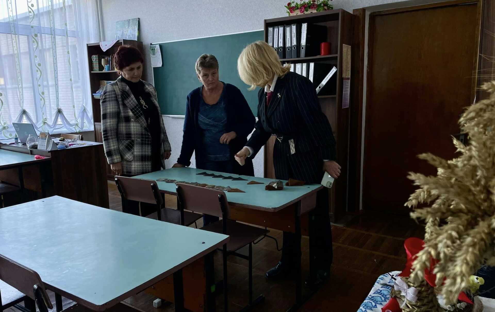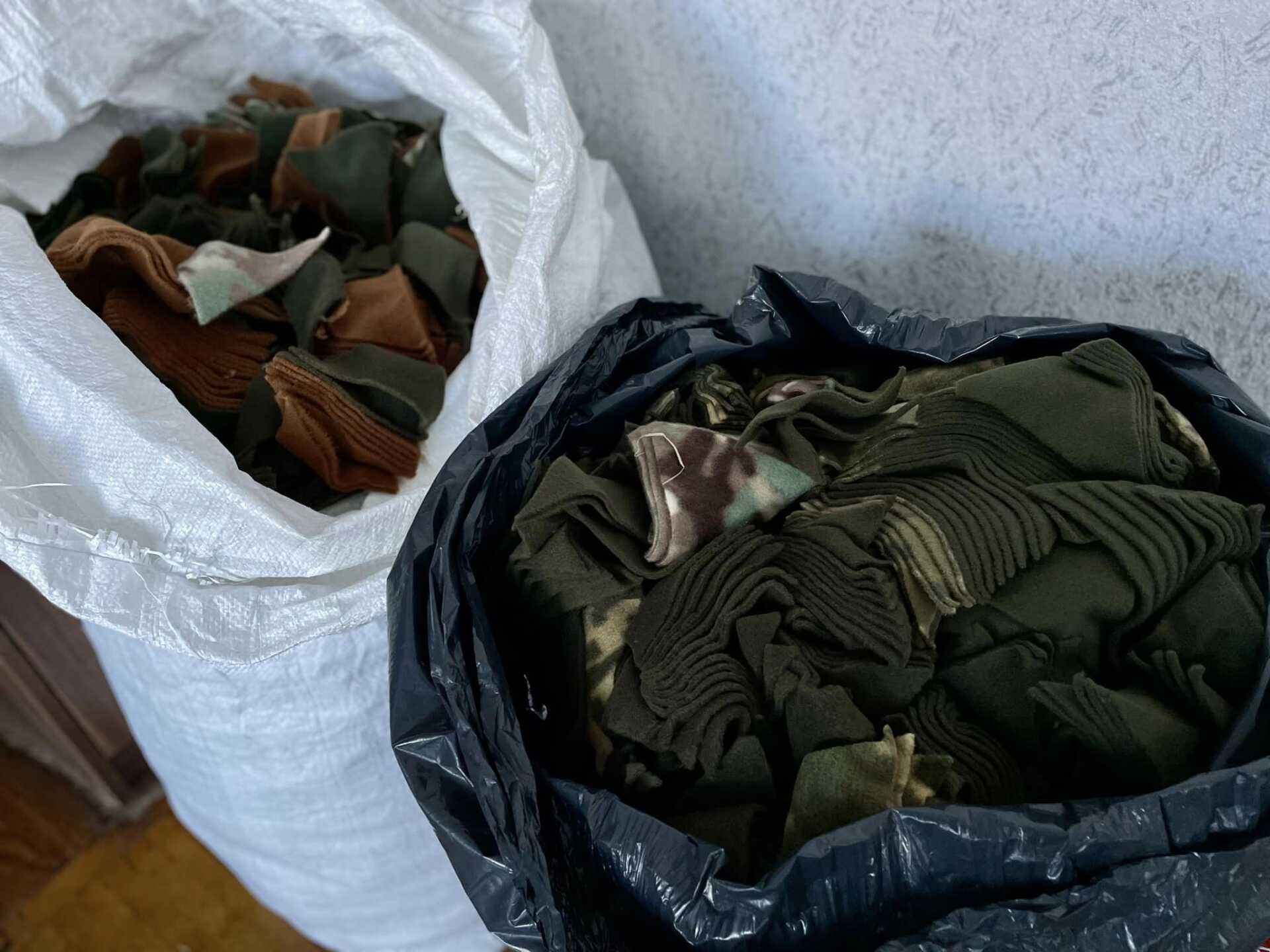 У навчальному закладі організовують плетіння маскувальних сіток. Гості привезли нарізану тканину для пошиття спеціальних стрічок, їх шитимуть учні на уроках трудового навчання.