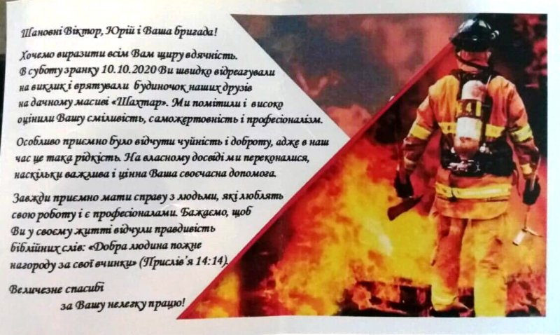 У листі відзначено злагоджену роботу рятувальників Віктора Корнійчука, Юрія Бричука та Олега Зварка під час гасіння пожежі, що трапилась нещодавно на дачному масиві «Шахтар» у місті Нововолинськ. Автори листа зазначають, що завдяки таким фахівцям цивільного захисту і професіоналам своєї справи люди можуть почуватися у безпеці.