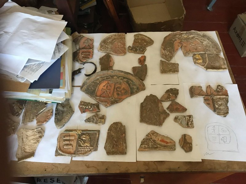 2. Заглиблену споруду пізньосередньовічного часу із котлованом та залишками багатого кахляного каміну, що попередньо може бути датована ХVІІ ст. (по титулатурі кахляної печі найімовірніше споруда належала Криштофу Шимковичу Шклинському, другому чоловіку княгині Олександри Марківни Сокольської).