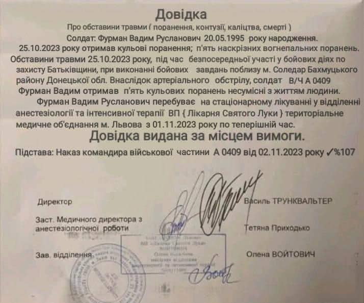 Фурман Вадим Русланович під час виконання бойового завдання отримав п’ять кульових поранень і врятував двох бойових побратимів. На даний момент Герой потребує дороговартісного лікування.
