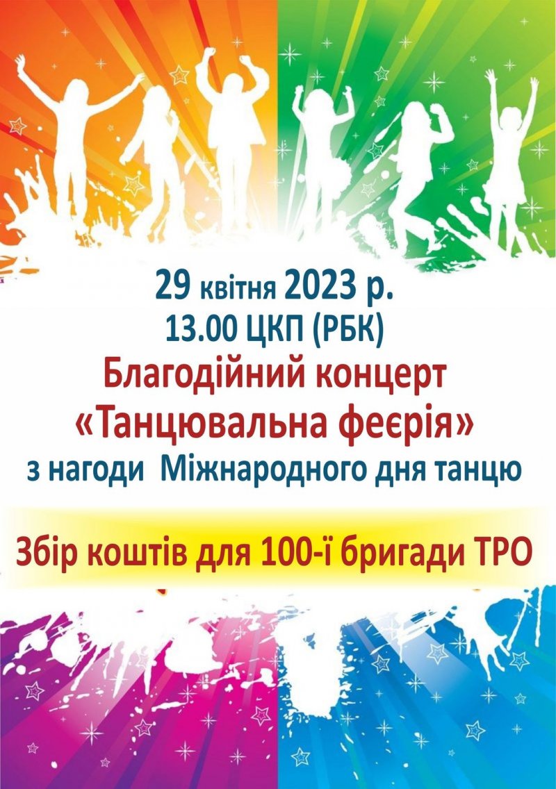 29 квітня у центрі культурних послуг (РБК) відбудеться благодійний концерт з нагоди Міжнародного дня танцю “Танцювальна феєрія”. Концерт, який розпочнеться о 13:00, матиме благодійну мету, адже протягом дійства буде проводитись збір коштів для 100-ї бригади ТрО.